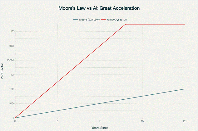 - 10-year improvement: Moore's Law ~100X; AI compute ~100,000X (1,000X faster)[21][20]