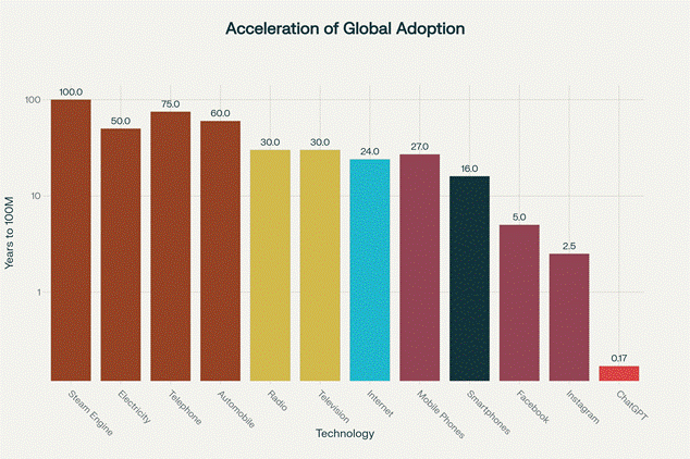 From steam engines taking a century to ChatGPT reaching 100 million users in 60 days—technology adoption has accelerated 600X